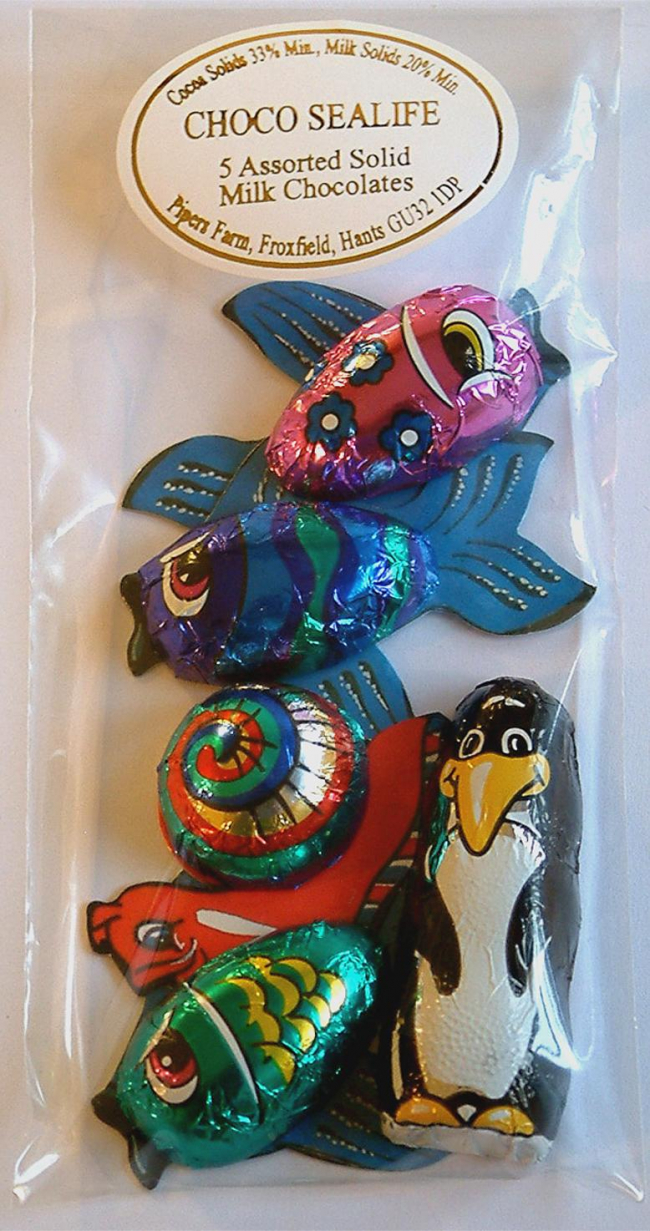 Solid Milk Chocolate (Cocoa Solids 33%) Foil wrapped. 3 Chocolate Fishes + 1 Penguin & 1 Sea Snail