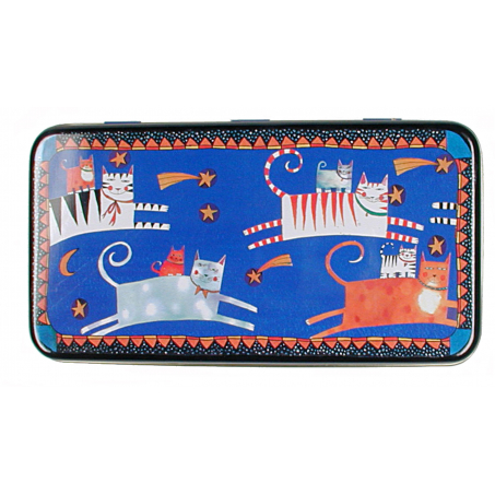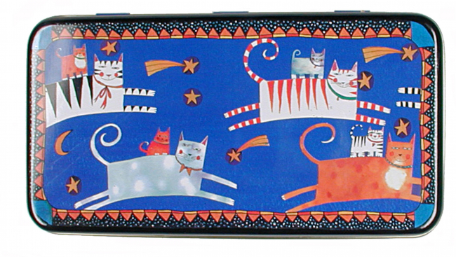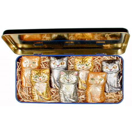 Solid Milk Chocolate (Cocoa Solids 33%) 6 Foil wrapped cats. Hinged Lid. Tin Size190x90 23mm