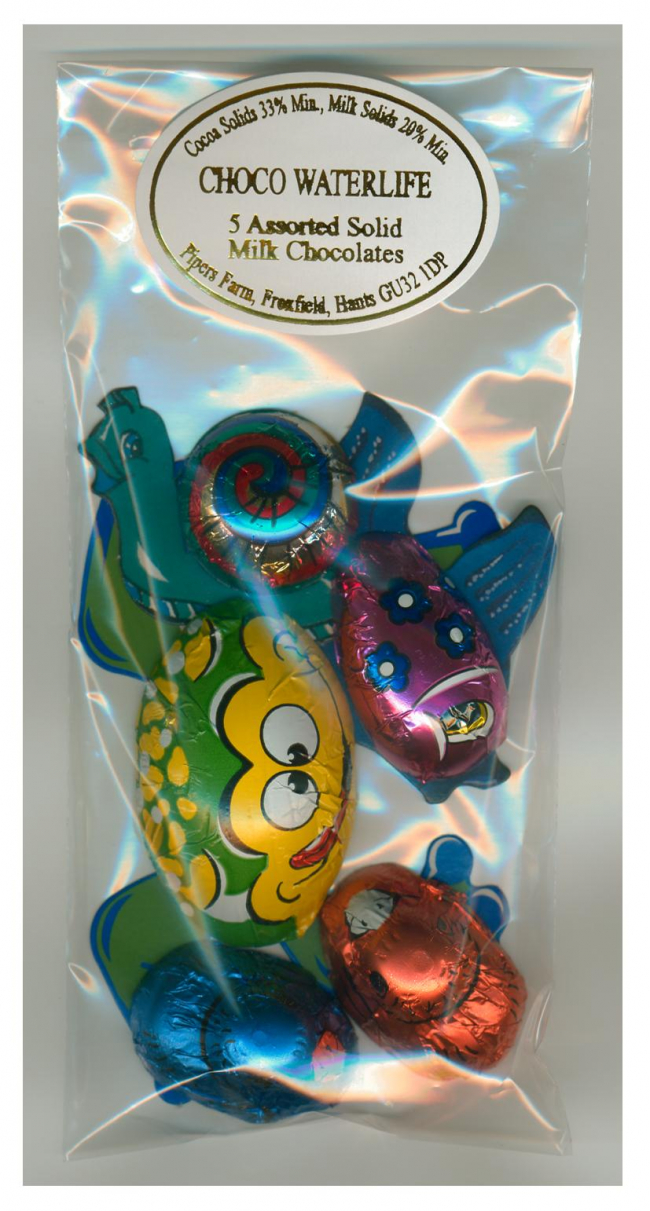 Solid Milk Chocolate (Cocoa Solids 33%) Foil wrapped. One Frog, Two Fishes & Two Ducks