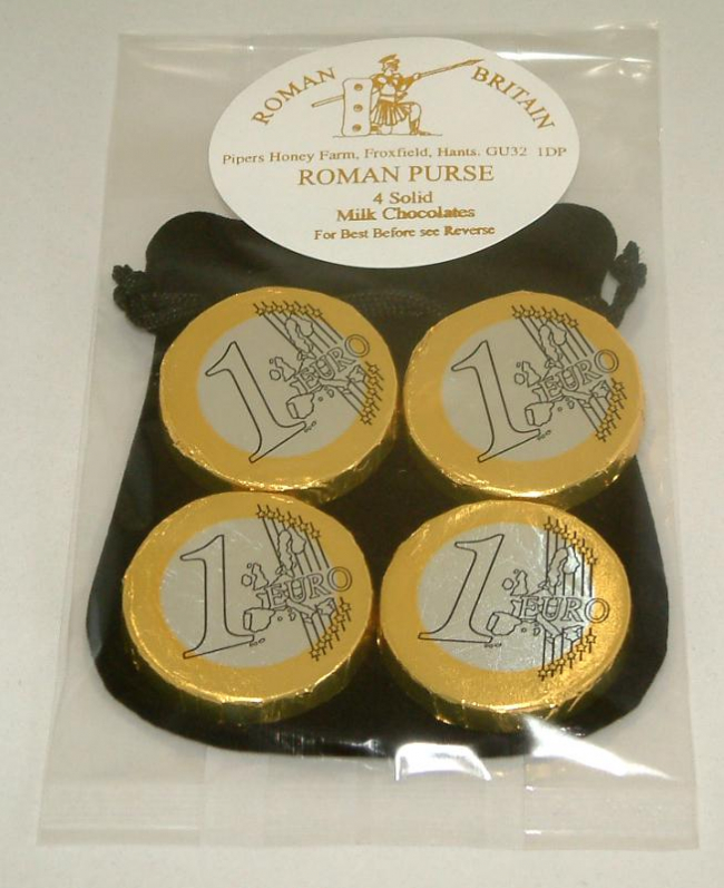 Solid Milk Chocolate (Cocoa Solids 33%) Foil wrapped. 4 Euro coins with a drawstring velour purse