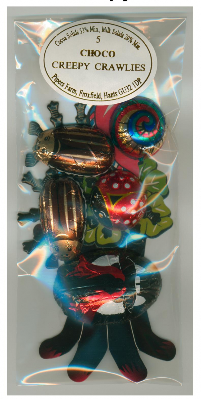 Solid Milk Chocolate (Cocoa Solids 33%) Foil wrapped. 1 each of Spider, Ladybird & Girlie Bug, 2 Weevils