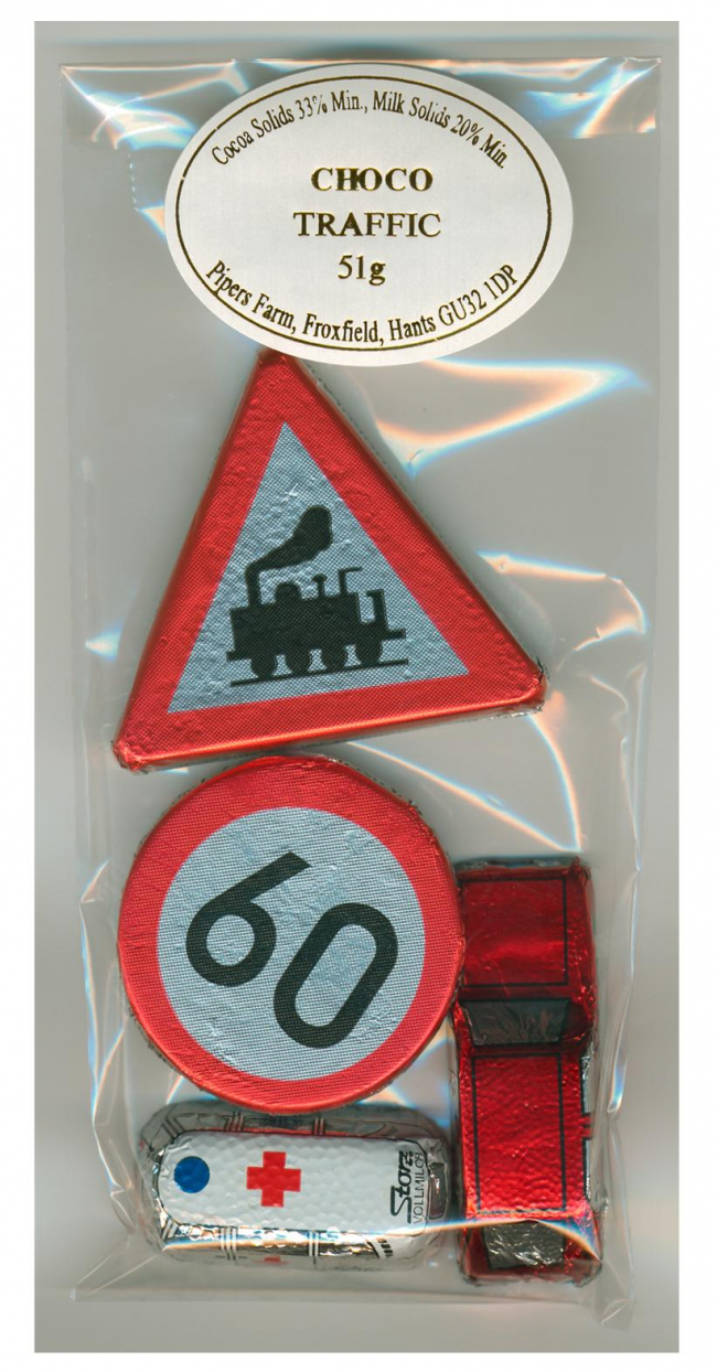 Solid Milk Chocolate (Cocoa Solids 33%) Foil wrapped. Two Vehicles + Two Road Signs.