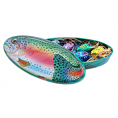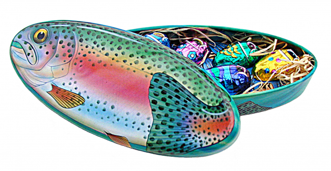 Solid Milk Chocolate (Cocoa Solids 33%) 6 Foil wrapped Fishes. Tin Size 183 x 73 x 28mm