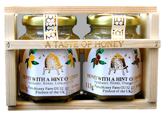 One x 113g Honey and Orange Oil + One x 113g Honey and Lemon Oil. Packed in a wooden crate.