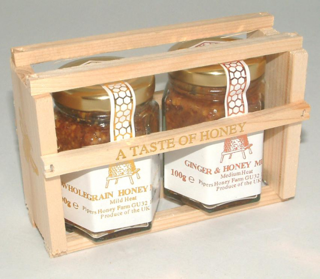 One x 100g Wholegrain Honey Mustard + One x Ginger & Honey Mustard in a wooden crate. Size